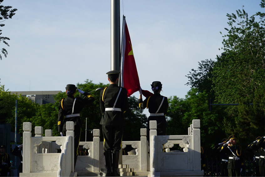 伴随着清晨的朝阳和国旗班同学们整齐的步伐,升旗仪式正式开始。在全体师生的注目中,五星红旗冉冉升旗。