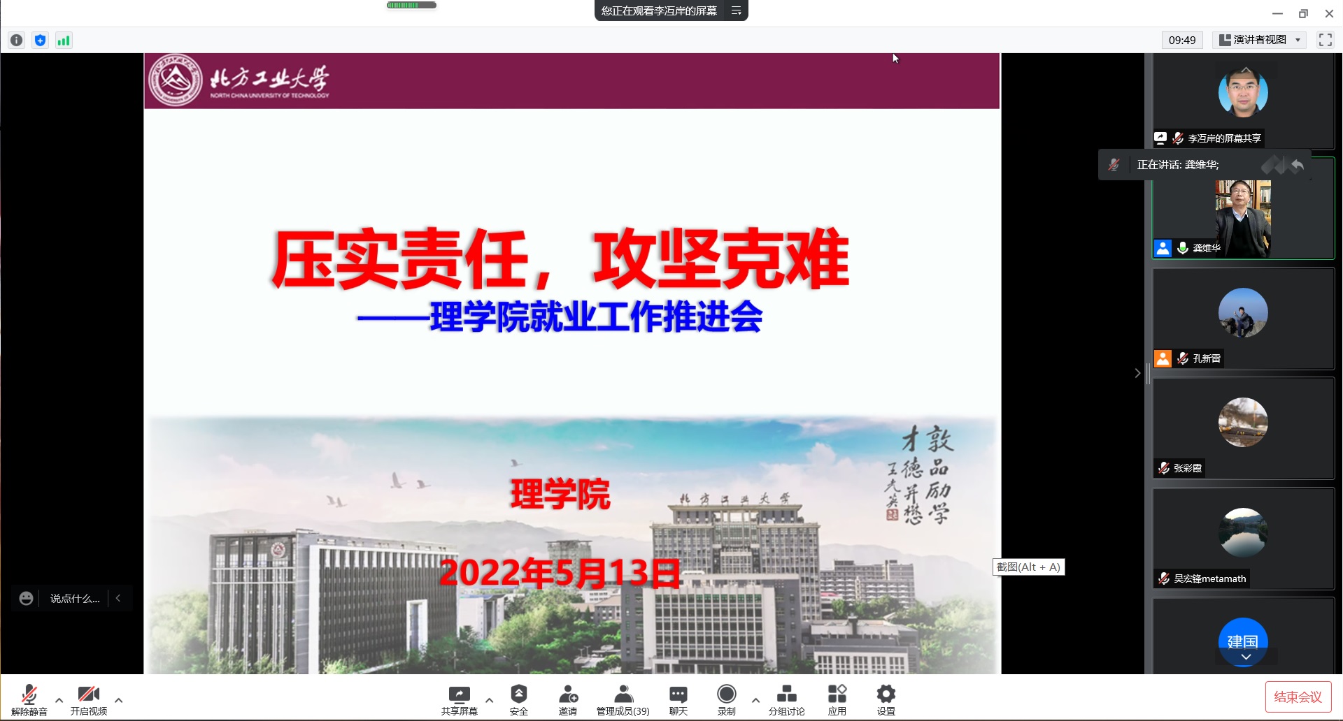 5月13日晚,betway西汉姆联官网召开2022届毕业生就业工作线上推进会,学院班子成员、各系主任、责任教授、学院全体研究生导师、数学系和统计系全体教师、办公室全体成员参加会议。会议由党委副书记李冱岸主持。