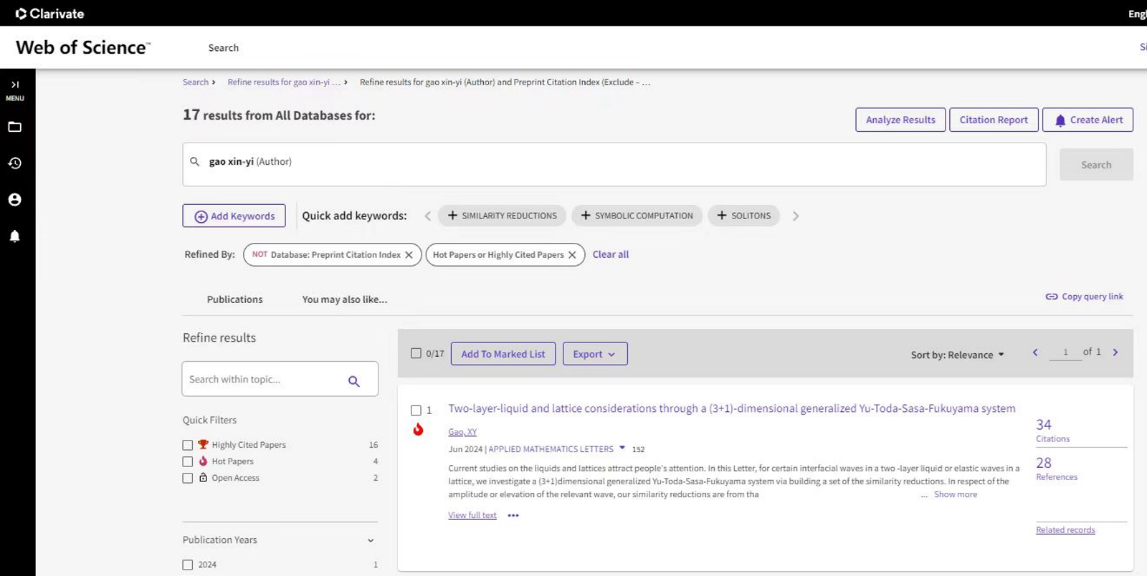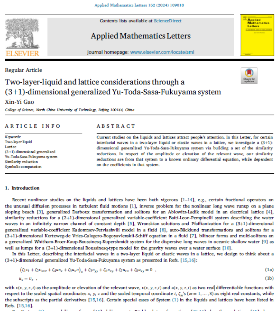 近日,公司betway西汉姆联官网教师高心怡在Applied Mathematics Letters(应用数学快报)发表的标题为Two-layer-liquid and lattice considerations through a (3+1)-dimensional generalized Yu-Toda-Sasa-Fukuyama system[通过(3+1)维广义Yu-Toda-Sasa-Fukuyama系统考察双层液体和晶格]的文章入选“ESI热点论文”。