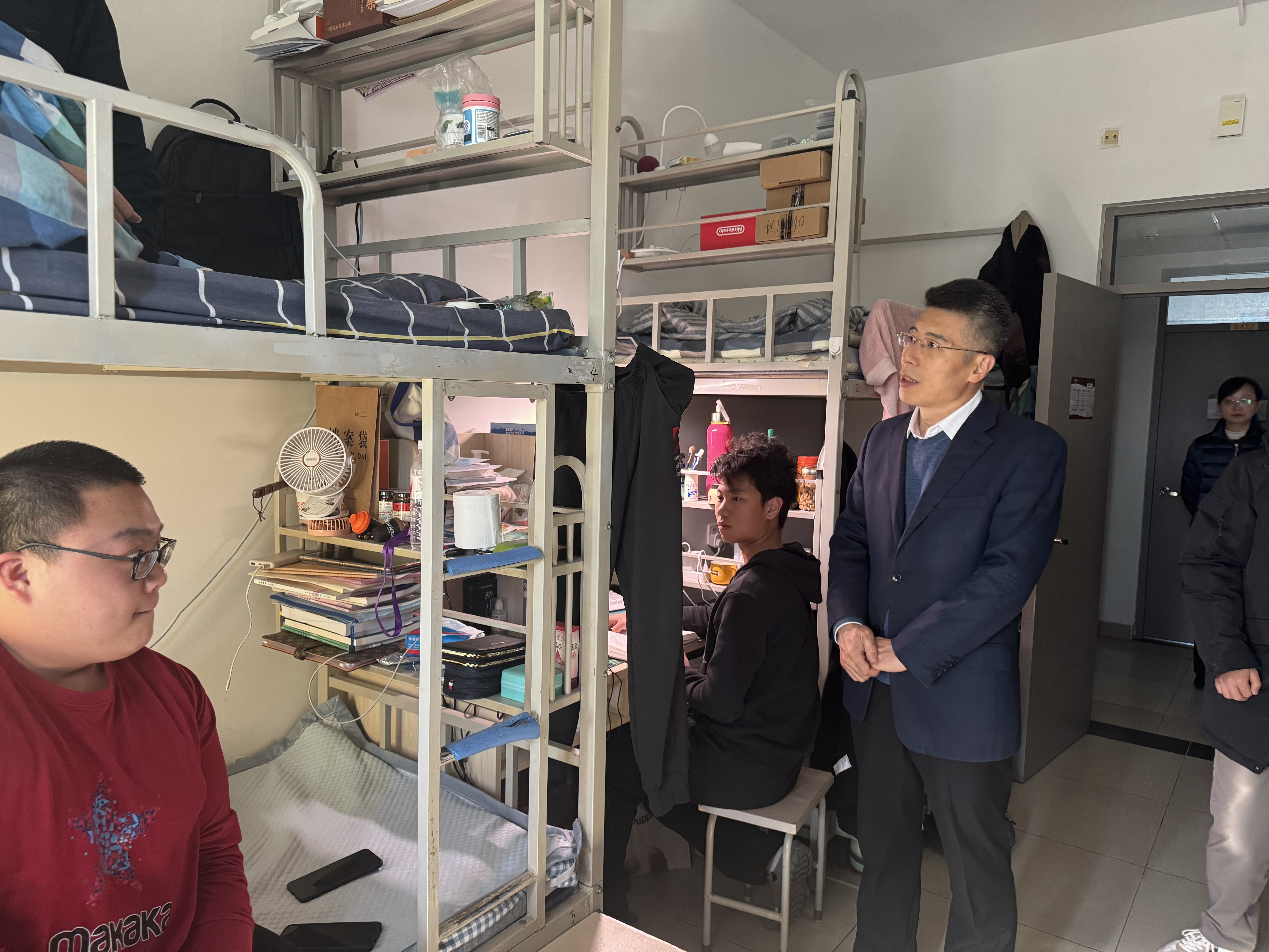走访期间,姜孔桥对员工宿舍的生活安全设施、卫生状况及周边公共设施进行了细致察看。特别强调了宿舍安全的重要性,提醒同学们注意用电安全,禁止使用违规电器,保持宿舍的整洁,共同营造“安全、整洁、和谐”的宿舍文化。与员工进行面对面交流时,姜孔桥询问了他们的学习、生活情况,勉励大家要珍惜大学时光,努力学习,积极参加校园活动,全面提升个人综合素质。