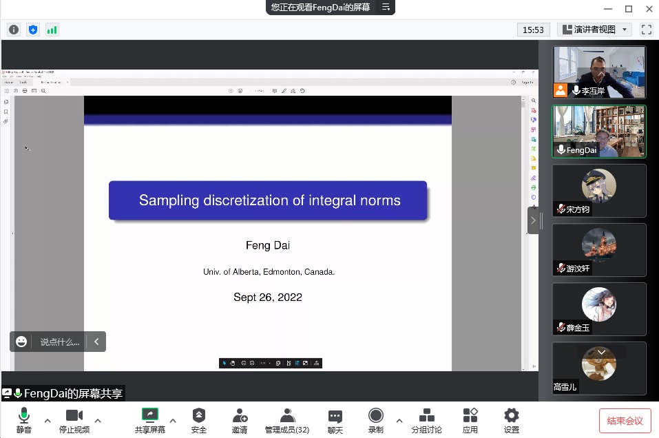 9月27日上午,应betway西汉姆联官网邀请,加拿大阿尔伯塔大学数学与统计学系副系主任、博士生导师戴峰教授通过线上腾讯会议作了题为“Sampling discretization of integral norms”的学术报告。betway西汉姆联官网四十余名师生聆听了报告。
