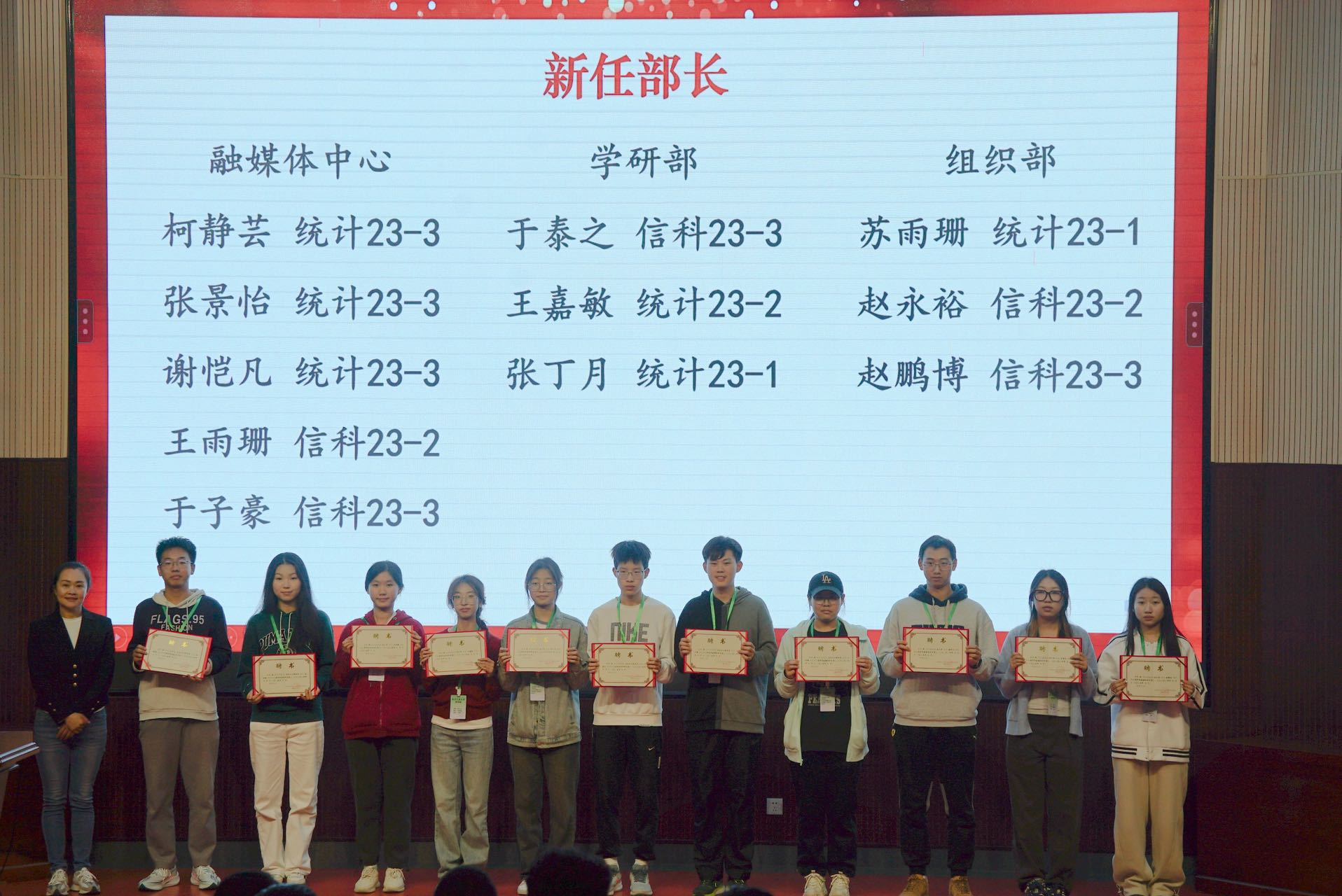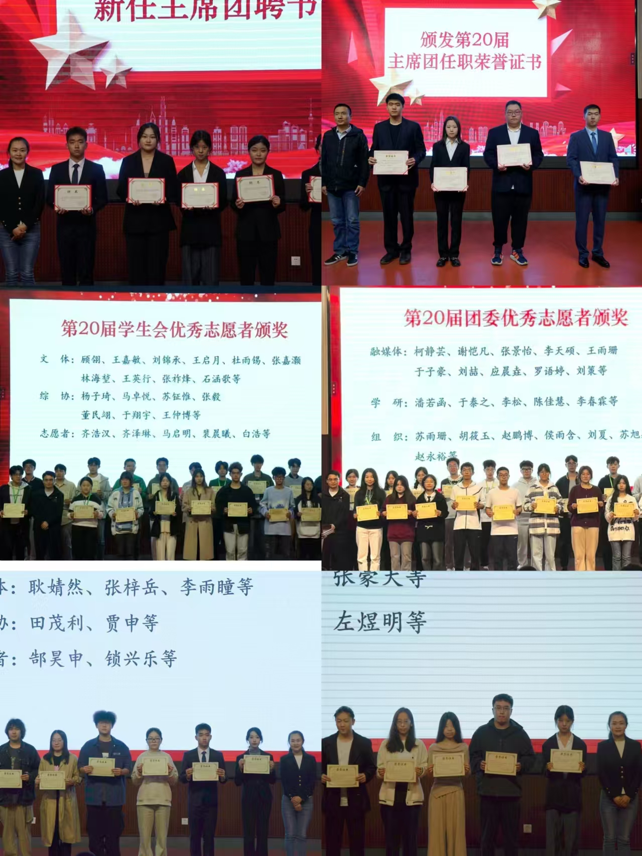 夏丹梅、熊敏为学院团学第二十届优秀部长和志愿者颁发了奖状,并为学院团学第二十一届主席团成员颁发聘书,贺映勇为学院团学第二十届主席团成员颁发了任职荣誉证书。